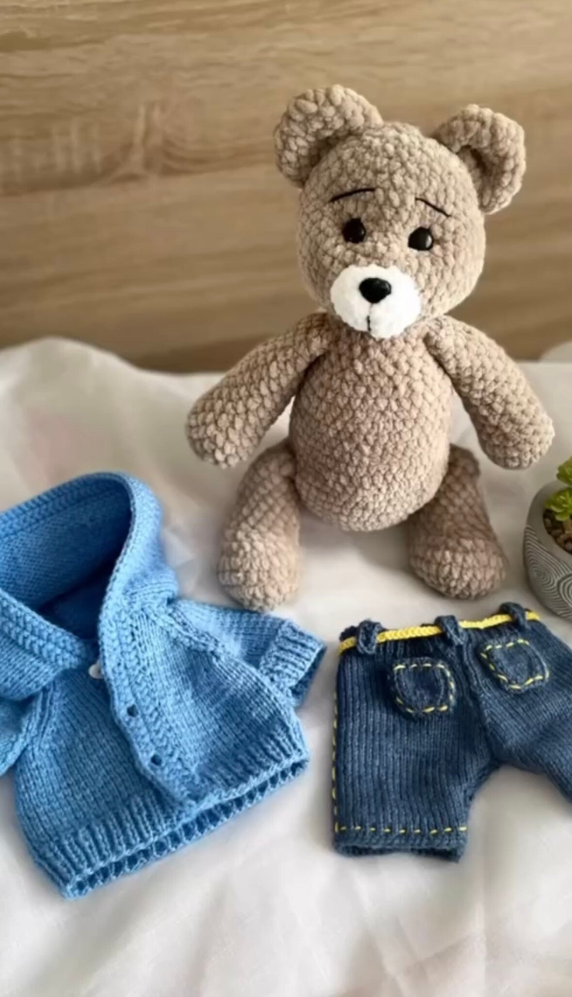 Dieser süße Plüschbär trägt einen Cardigan und eine Jeans und ist individuell bestellbar, Sie können zwischen den unten angegebenen Farben auswählen. Sehr gut kommt er bei unseren Kunden als Geschenk zu Geburtstagen an. Er besteht aus super weicher Häkelwolle und ist zu 100% handmade.